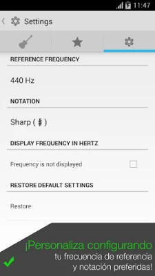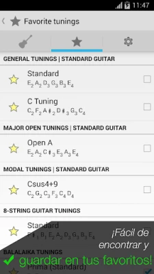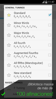 Descubre las cualidades ocultas y el potencial sonoro de tu instrumento con cada nueva afinación que Afinador de Guitarra Pro pone a tu alcance. Prepara tu música para sonar siempre en su mejor versión.