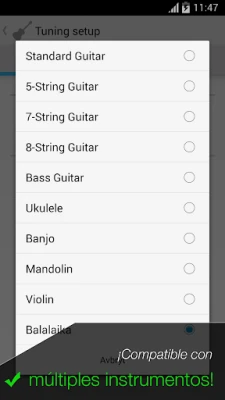 Afinador de Guitarra Pro no se limita a un solo instrumento. Al ser completamente cromático, ofrece una compatibilidad versátil con una amplia gama de cuerdas. Para aquellos que prefieren la afinación auditiva, hemos integrado una extensa colección de muestras de sonido de instrumentos reales, grabadas con la más alta calidad, permitiéndote afinar con la calidez y autenticidad que solo el oído puede apreciar. Además, su vasta biblioteca de afinaciones preestablecidas te abre un mundo de posibilidades para explorar diferentes tonalidades y estilos, abarcando desde guitarras y bajos hasta balalaikas, violines, ukeleles y mucho más.