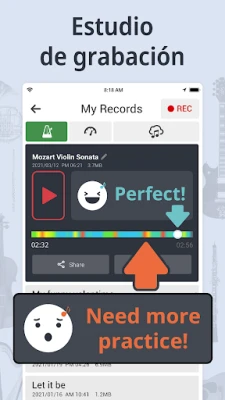 Experimenta la inmediatez en cada sesión. Con una interacción mínima, puedes activar o detener el metrónomo, encender el afinador con precisión o iniciar grabaciones de tu práctica. El metrónomo integrado no solo ofrece control de ritmo, sino que innova con modos visuales y táctiles: desde un flash de luz que marca el tempo hasta vibraciones discretas, garantizando que sientas el pulso incluso en entornos ruidosos. La función de grabación te permite capturar tu progreso y escuchar tus interpretaciones al instante, facilitando una mejora continua.
