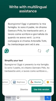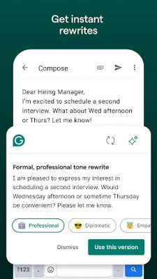 La magia de Grammarly radica en su capacidad de funcionar discretamente en segundo plano, integrándose sin esfuerzo con cualquier teclado Android que prefieras. Mientras tecleas, esta avanzada herramienta analiza en tiempo real tu gramática, ortografía, puntuación y el tono general de tu texto, brindando sugerencias instantáneas. Pero va más allá de la corrección básica; su innovadora función de reescritura, impulsada por IA generativa, te ofrece la posibilidad de explorar nuevas formas de expresar tus pensamientos, haciendo que tu prosa sea más concisa, descriptiva, formal o segura con solo un toque.